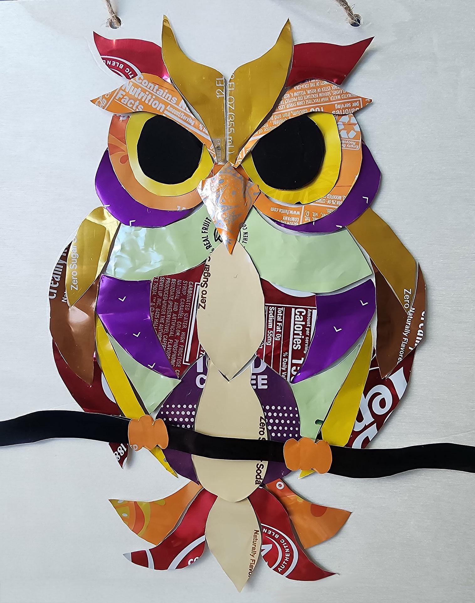You'll feel the intensity from this whimsical owl wall hanging. Each section of this colorful piece comes from different aluminum drink cans.