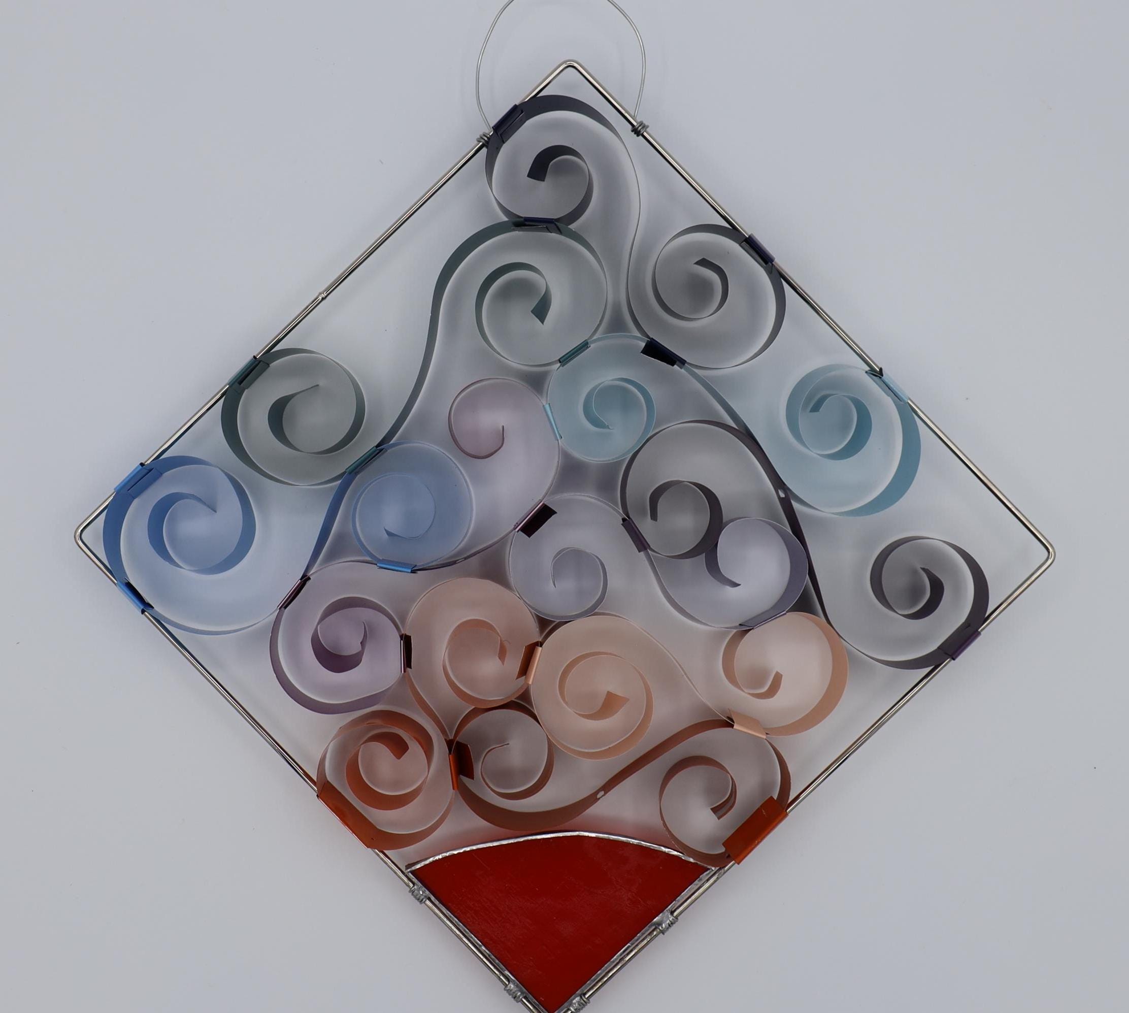 This item has been shaped by hand from the slats of old metal mini-blinds. The sun is stained glass soldered in place. Each item will vary slightly as they are individually crafted.